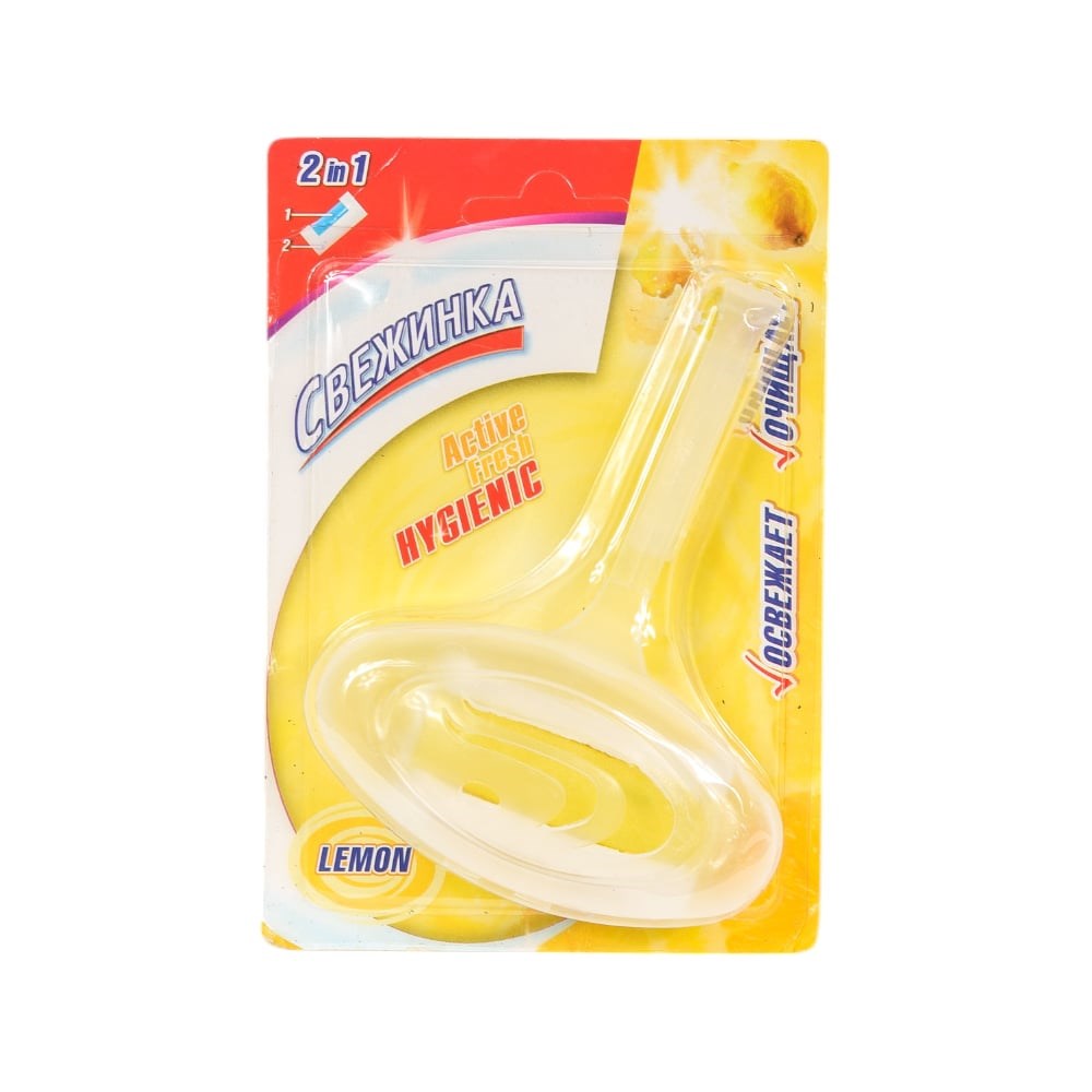 Освежитель Свежинка Блистер WC с гелевой вставкой лимон 40 гр 1983 - одновременно моющее и освежающее средство для унитаза длительного действия. Благодаря наличию гелевой вставки с концентрированной отдушкой Освежитель на 50% эффективнее ароматизирует помещение, чем обычный освежитель WC. Обладает высокими дезинфицирующими и защитными свойствами. Освежитель уничтожает бактерии, препятствует отложению известкового налёта, водного и мочевого камня.
