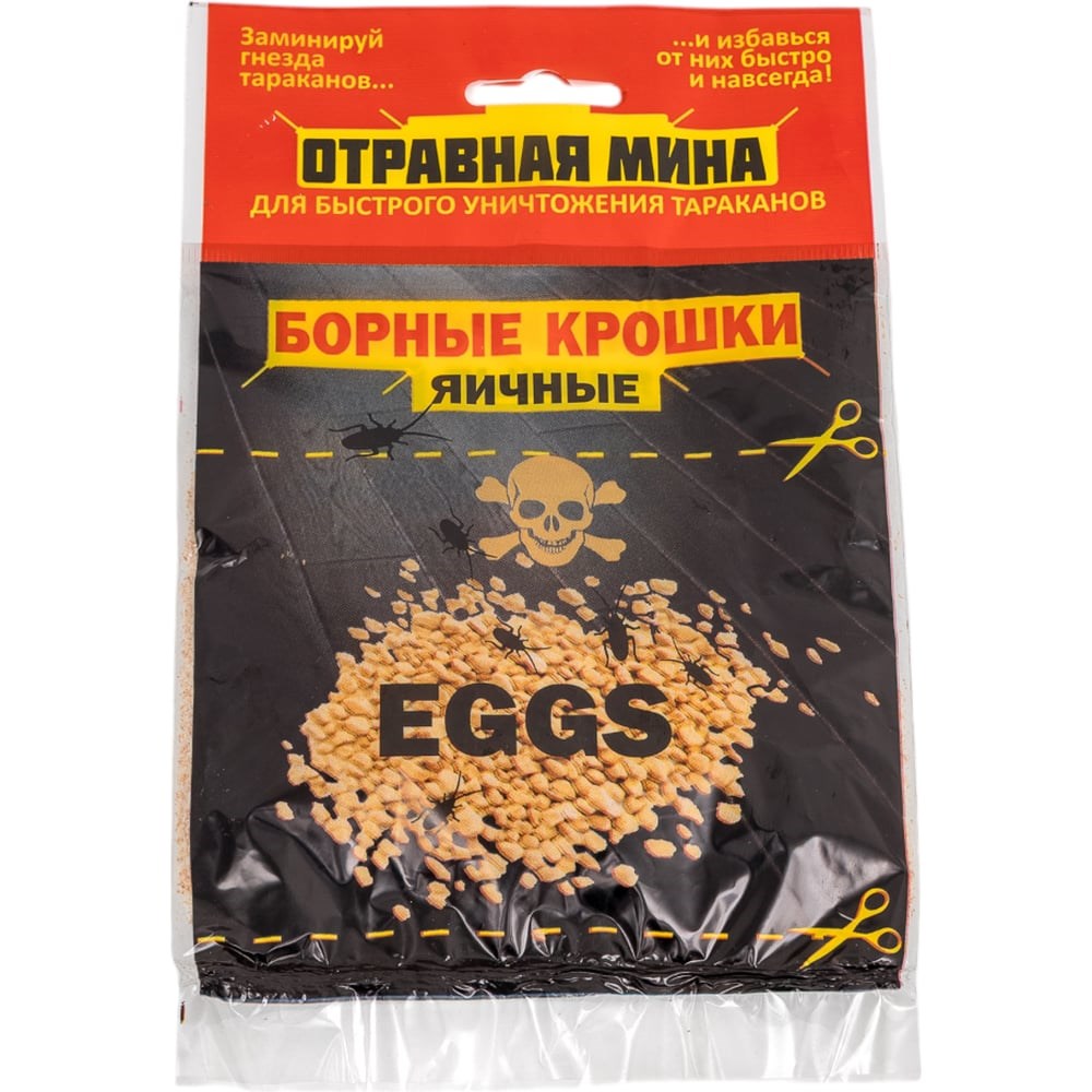 Отравная МИНА ом борные крошки яичные 21016 является средством борьбы с тараканами. Помогает быстро и навсегда избавиться от тараканов, за счет чего отличается практичностью. При ее использовании гибель тараканов наступает через 3-5 суток. Проста в применении, поэтому не требует специальных навыков.