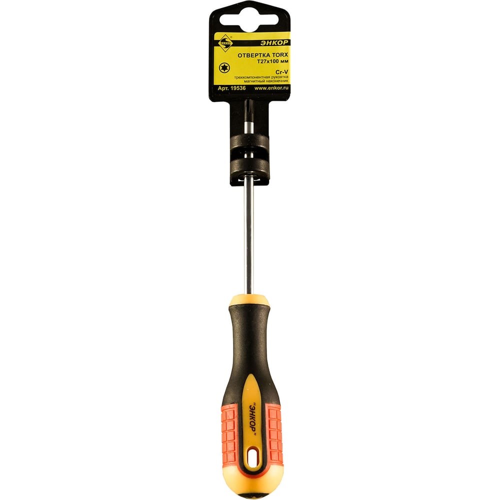 Отвертка Энкор Torx T27x100мм трех комп рук 19536 предназначен для работ с резьбовыми соединениями. Стержень отвертки выполнен из качественной хромованадиевой стали, что обеспечивает прочность и долговечность. Эргономичная трехкомпонентная рукоятка гарантирует надежный хват и комфортную эксплуатацию. Намагниченный наконечник надежно удерживает крепеж при работе.