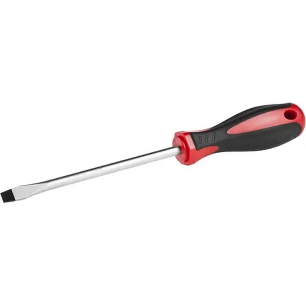 Отвертка предназначена для проведения слесарных работ с крепежом, имеющим прямой шлиц. Стержень с намагниченным наконечником изготовлен из высокопрочной хромованадиевой стали, что обеспечивает надежность и долговечность. Двухкомпонентный материал рукоятки исключает проскальзывание инструмента в руке.