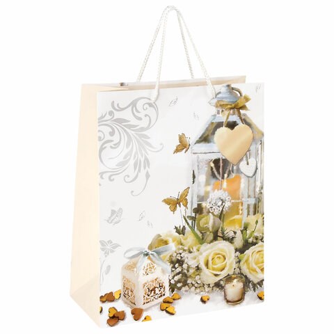 Изготовлен из ламинированной мелованной бумаги с веревочными ручками из полипропилена. Размер – 26x13x32 см. Пакет выполнен в белых и бежевых тонах с изображением роз, подсвечника и подарочной коробочки, выполненных акварельной техникой.