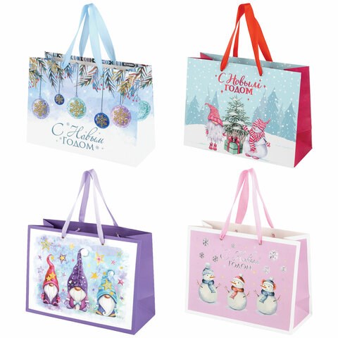 Подарочный новогодний пакет изготовлен из ламинированного мелованного картона с ленточными ручками из полиэстера. Размер – 27х20х11 см. Пакет выполнен с изображением новогодних атрибутов. С лицевой стороны пакета некоторые детали покрыты тиснением фольгой или глиттером, в зависимости от дизайна.