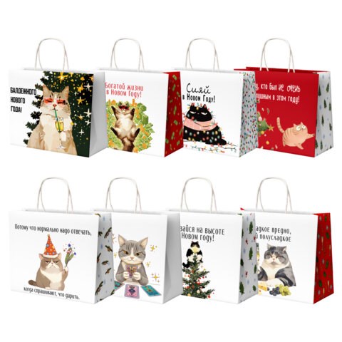 Подарочный новогодний пакет изготовлен из крафт-бумаги, снабжен бумажными ручкам. Размер – 28х14х24см. На пакете изображены забавные иллюстрации котиков в новогодней тематике и смешные надписи (ассорти без возможности выбора), которые точно вызовут улыбку.