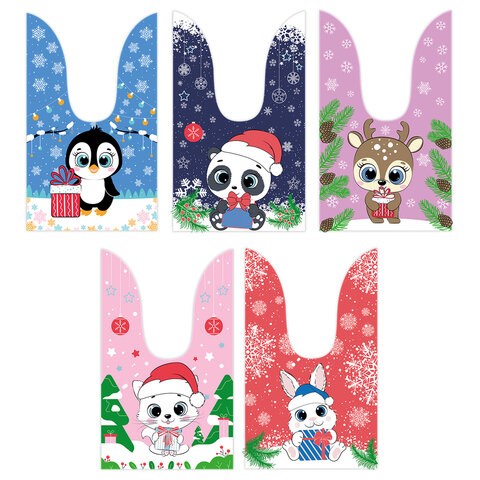 Набор из 35-и подарочных пакетиков, изготовленных из полиэтилена, имеет удобную форму "ушек" для завязывания. Также в комплекте идут металлические зажимы, которые надежно фиксируют пакетики в закрытом виде. Размер каждого пакета — 13,8х23 см, что позволяет легко поместить внутрь небольшие подарки и сувениры. На пакетиках изображены милые зверюшки в новогодней тематике — пингвины, олени, зайчики и другие герои зимней сказки, которые уже готовы к встрече Нового года.