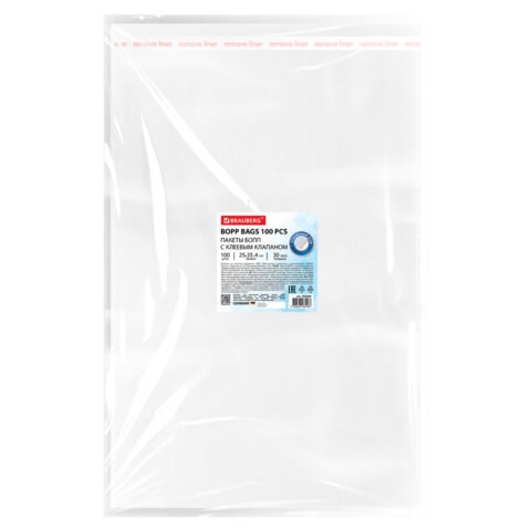 Пакеты БОПП с клеевым клапаном, КОМПЛЕКТ 100 штук, 25х35 + 4 см, 30 мкм, с усиленным швом, BRAUBERG, 700409