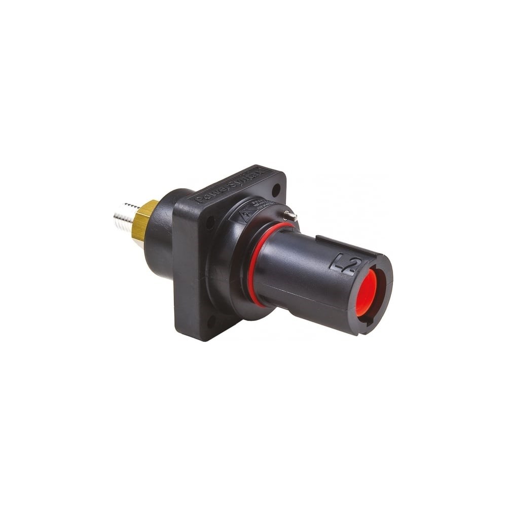 Панельная вилка Valentini SPX 480А/1P/IP67 L2 SPX4PD2BK с защитой пальцев IP2X для предотвращения случайного прикосновения с токоведущими частями. Винтовое соединение кольцевого наконечника М12 для кабеля 25-95 мм2. Рабочая частота 50/60Гц.