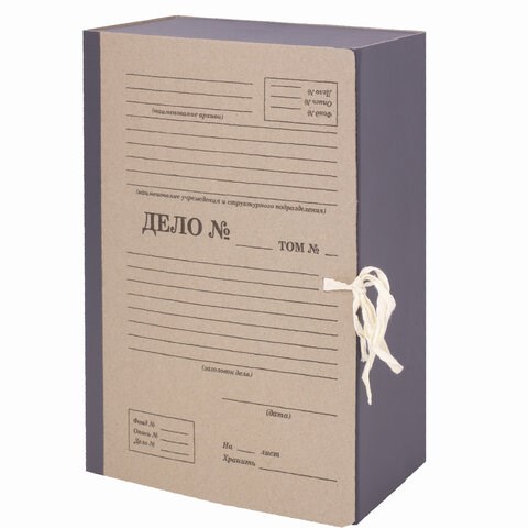 Папка стандартного формата А4 вмещает до 1200 листов. Изготовлена из переплетного картона с покрытием из бумвинила. Ширина корешка составляет 120 мм. На лицевой стороне есть поля для подписывания. Закрывается с помощью 4-х тканевых завязок.