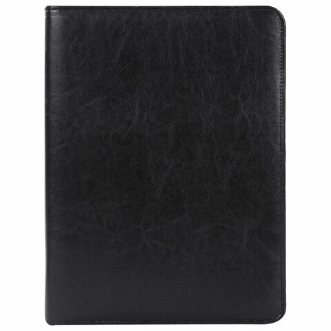 Изделие закрывается на молнию. Внутри расположены объемный карман для документов, большой карман на молнии, отрывной блокнот формата А4 и органайзер для визиток и письменных принадлежностей. Размер папки – 340х260 мм.