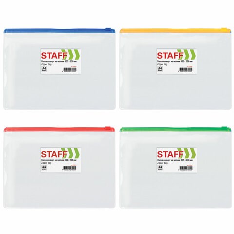 Папка-конверт на молнии А4 (335х238 мм), карман для визиток, прозрачная, 0,12 мм, STAFF, 229547