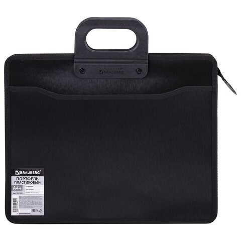 Портфель формата А4+ (390х320х120 мм) изготовлен из плотного пластика толщиной 0,7 мм, выполнен в солидном черном цвете с фактурой "под дерево" и имеет 4 отделения. Усиленные ручки обеспечивают надежность в процессе эксплуатации. Портфель застегивается на молнию. Края окантованы тканью, что придает изделию презентабельный вид.