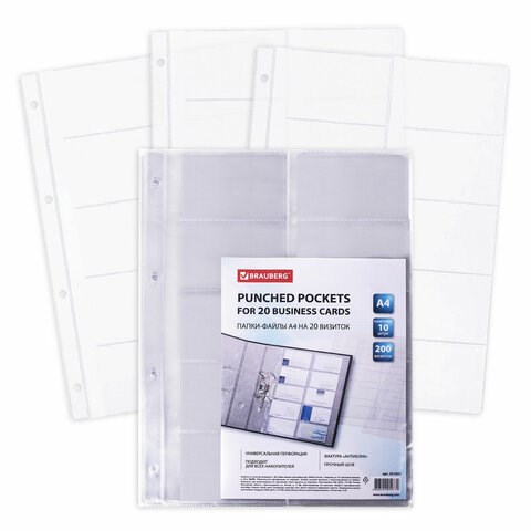 Папки-файлы на 20 визиток BRAUBERG, КОМПЛЕКТ 10 шт., А4 (210х297 мм), перфорированные, ПВХ 120 мкм, 231831