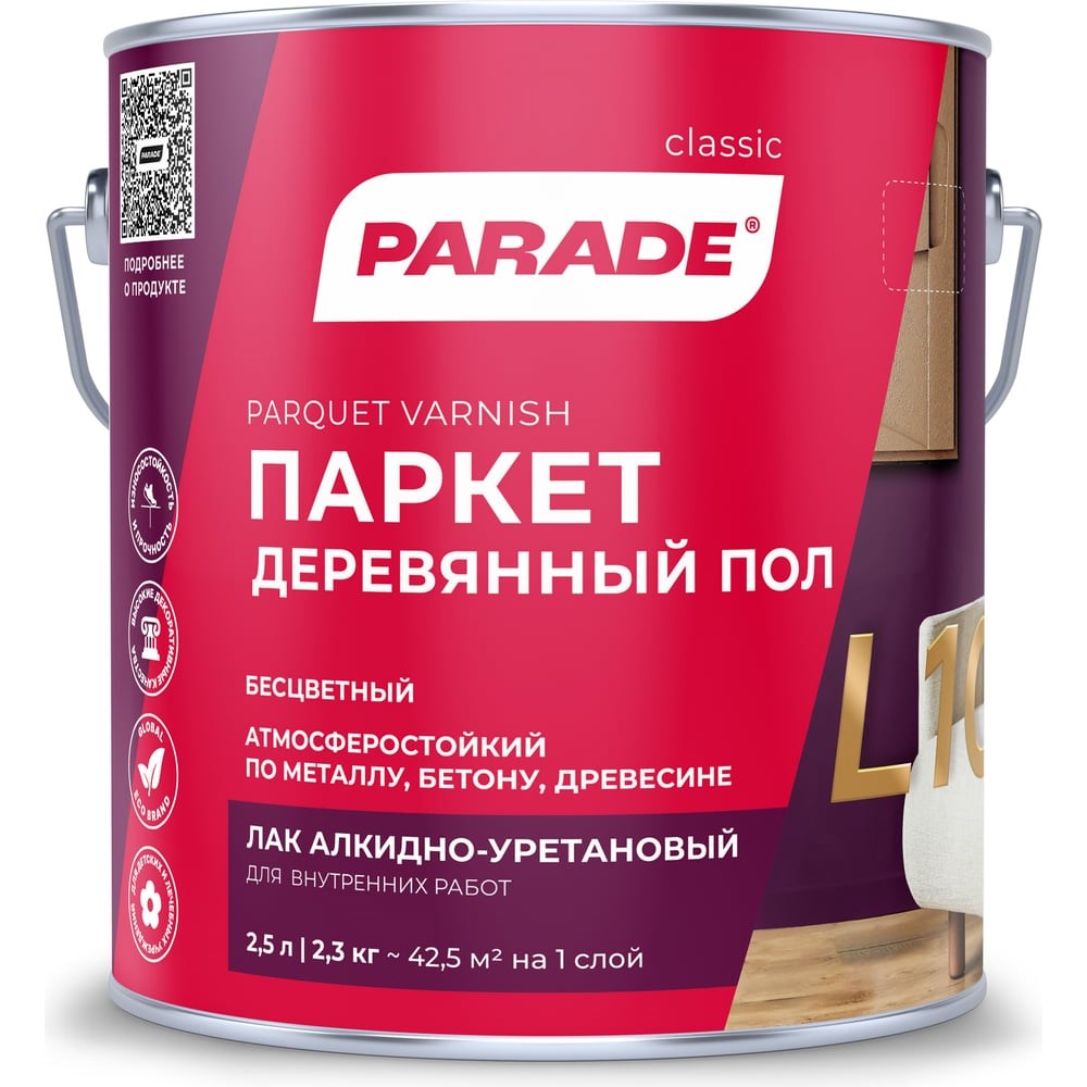Лак паркетный алкидно-уретановый глянцевый PARADE L10 Паркет & Деревянный пол 2,5 л Россия 90001484418 - высококачественный однокомпонентный лак на алкидно-уретановой основе. Образует прозрачное эластичное износостойкое покрытие, устойчивое к воздействиям воды, бытовых моющих средств.