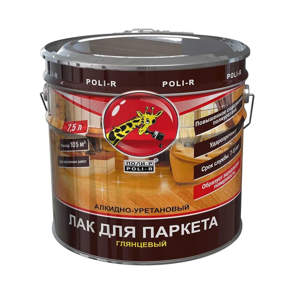 Паркетный лак Poli-R (глянцевый; 7.5 л) 13557Бесцветный однокомпонентный паркетный лак ПОЛИ-Р на алкидно-уретановой основе. Предназначен для внутренних работ. Образует шелковисто-матовое износостойкое покрытие. Применяется для защиты и декоративной отделки паркетных и деревянных полов с нормальной эксплуатационной нагрузкой, а также для отделки других деревянных поверхностей: лакирования мебели, дверей, ДВП, ДСП и прочих деревянных элементов внутри помещений. Обладает превосходной способностью сглаживать дефекты поверхности при нанесении в 2-3 слоя. Лак паркетный Поли-Р отлично проникает в поры древесины, подчеркивает ее текстуру и защищает от атмосферных и механических воздействий. Расход — 1л на 12-15 м2 Растворитель — уайт-спирит Время высыхания между слоями — 4-6 часов Полное время высыхания — 24 часа Полный набор свойств (до эксплуатации) — 3 суток Стойкость к воздействию воды и 0.5% растворам моющих средств