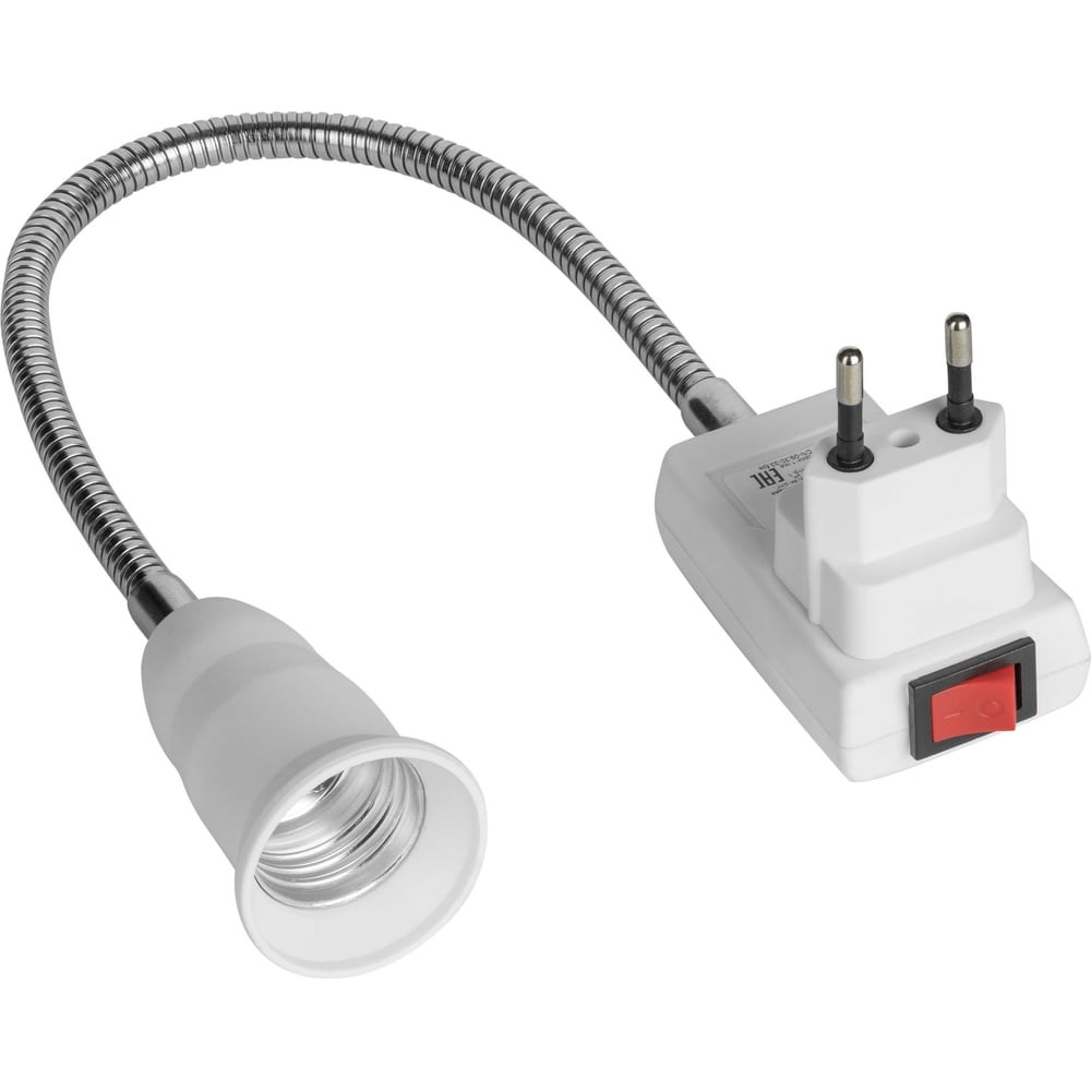 Переносной гибкий светильник с переходником, выключателем и вилкой белого цвета обеспечивает возможность регулировки направления освещения. Правильное распределение света благотворно влияет на зрение и повышает работоспособность. Данный переходник позволяет изменять дизайн осветительного прибора одним движением. Для него подходят любые лампы со стандартным цоколем Е27.