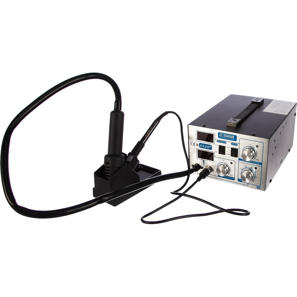 Паяльная станция, фен+паяльник ELEMENT 852D+ 15301 - компрессорная комбинированная двухканальная паяльная станция, которая отличается высокой производительностью и качеством пайки. Она предназначается для работы с такими компонентами, как: PLCC, SOP, SMD, QFP, SOIC, BGA, CHIP. Представленная термовоздушная монтажно-демонтажная система с цифровой индикацией фактической температуры потока горячего воздуха имеет минимальную погрешность при работе с различными материалами.