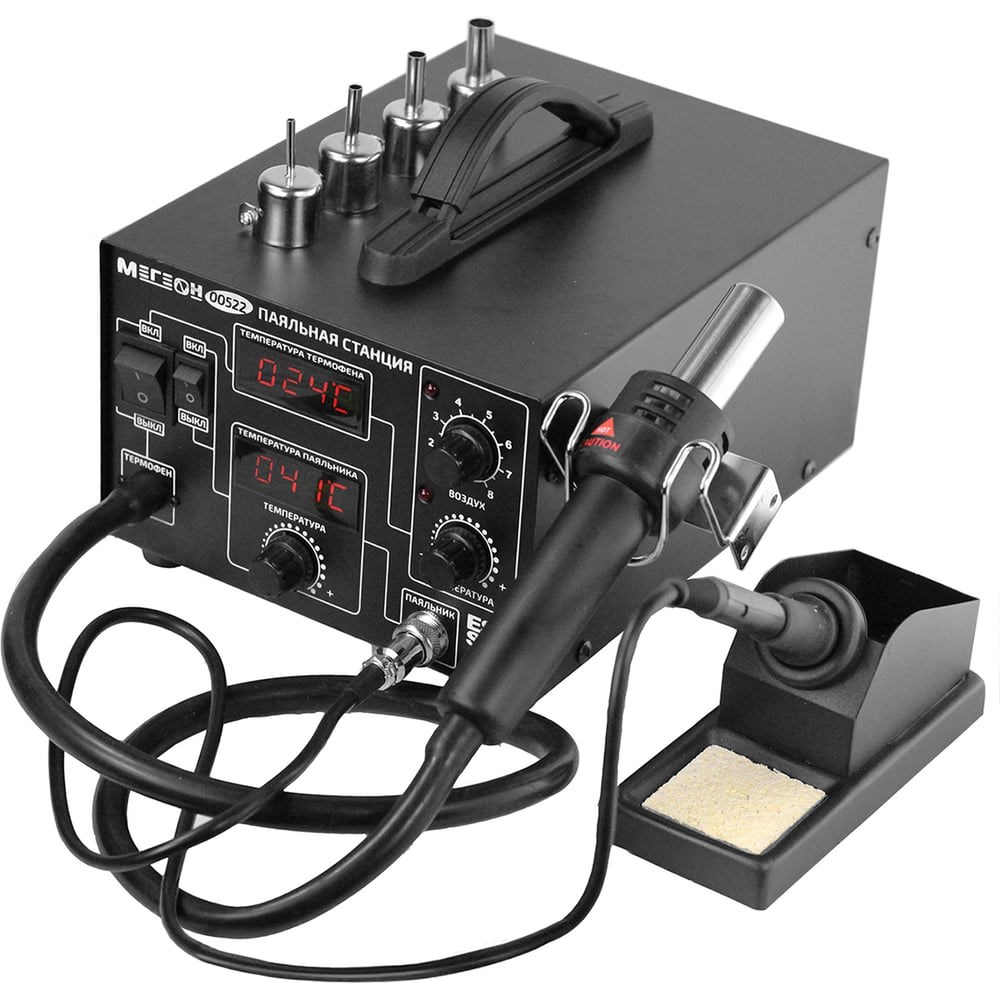 Паяльная станция МЕГЕОН 00522 подойдет для различного рода пайки, создания или ремонта электрооборудования. Данное устройство обеспечивает стабильную работу, равномерный нагрев, обладает регулировкой температуры от 200 до 480°С. На корпусе расположен цифровой дисплей. Держатели для паяльника и фена делают работу с этой станцией комфортной и многофункциональной.