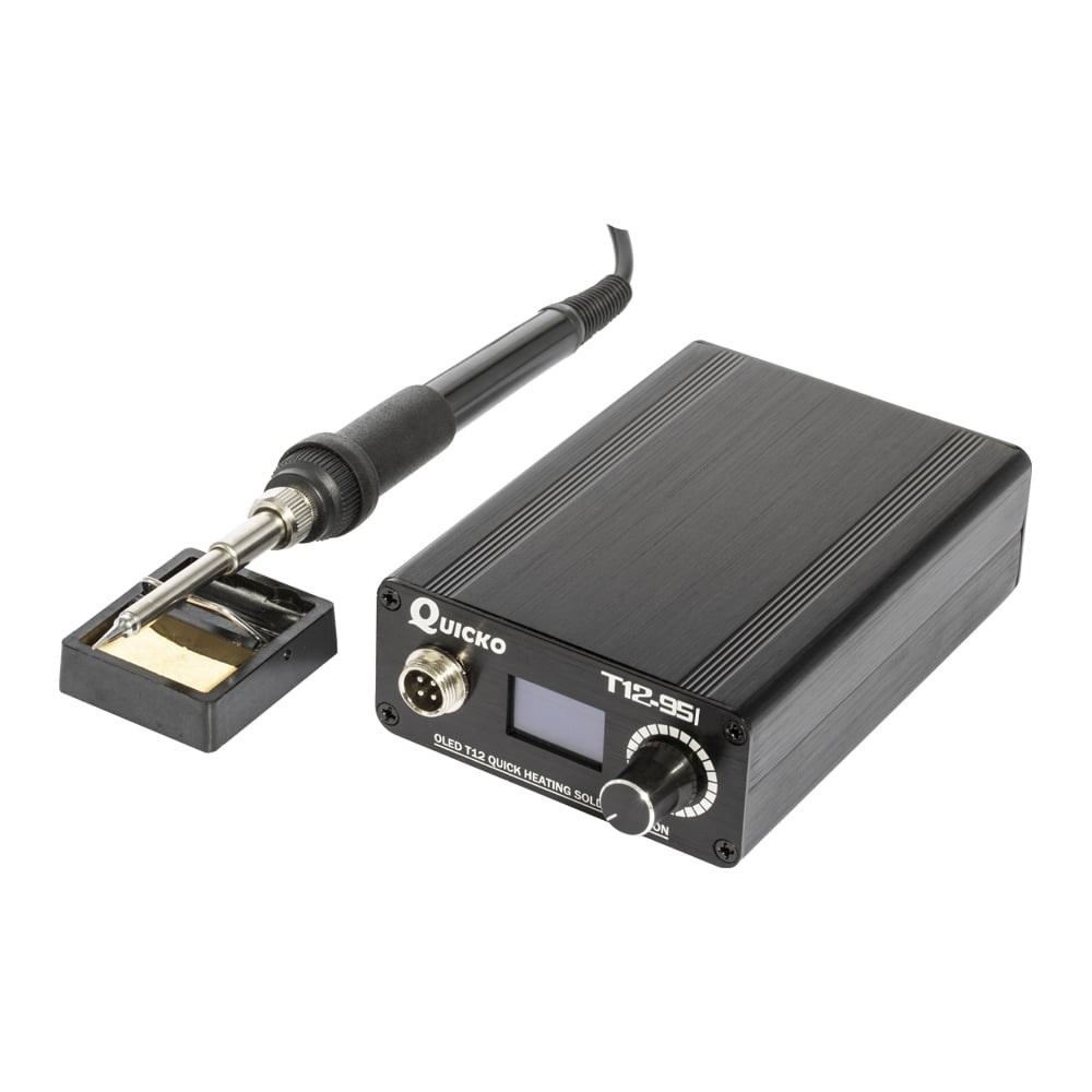 Паяльная станция цифровая Quicko T12-951 с цифровым дисплеем и терморегулировкой, предназначена для монтажа радиоэлементов. Универсальное устройство отлично подойдёт для домашнего использования, а также в промышленных и коммерческих мастерских. Паяльник оснащён жалом по передовой технологии с индукционной функцией нагрева, которое несёт название T12 . Жало для паяльника T12 нагревается за считаные секунды и благодаря керамическому стержню стабильно держит температуру с минимальной погрешность. Цифровая паяльная станция оснащена LED экраном , который отображает меню богатое меню настроек и функций. Паяльная станция мини Quicko T12-951 имеет такие функции, как : отображение калибровки температуры, спящий режим при котором температура жала будет удерживать а пределах 150 градусов , отключение автоматического питания , установка времени нагрева , турбо режим нагрева жала. Паяльная станция с регулировкой температуры работает от сети 220В , максимальная мощность базы 108 Вт и температурный диапазон от 200 до 480 градусов, нагрев паяльника 183 градуса меньше чем за 8 секунд, максимальная У ручки паяльника разъём GX12 с типом 4 pin – это означает, что подойдут любые ручки паяльника с жалами t12 серии. Цифровая паяльная станция мини легко и быстро можно производить BGA пайку, сложно технические ремонты радио и электрооборудования.