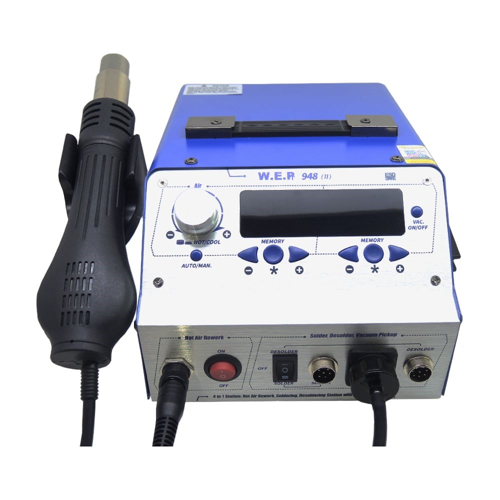 Паяльная станция W.E.P 948-II фен+паяльник+оловоотсос+вакуумный съемник М7746089 имеет один разъем для подключения пистолета и паяльника. Тип фена: турбинный, до 120 л/мин. Регулировка температуры: паяльник: 200-480°C /пистолет: 350-480°С/фен: 100-480°С. Мощность паяльника 60Вт, мощность оловоотсоса 80Вт.