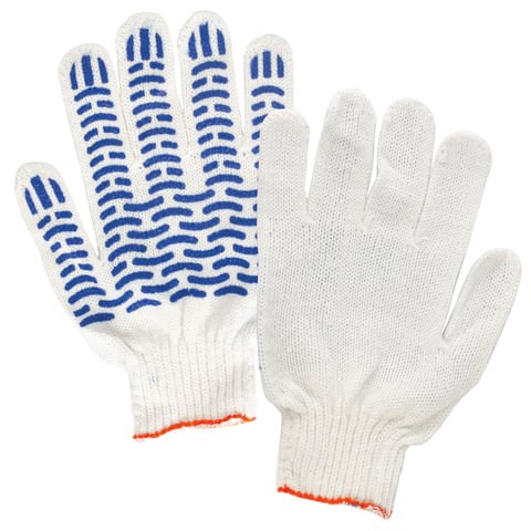 Изготовлены из хлопчатобумажной пряжи плотностью 166 текс с покрытием из поливинилхлорида с нанесением рисунка на внутреннюю сторону перчатки. Покрытие ПВХ помогает обеспечить плотный захват и предотвращает соскальзывание детали. Резинки на манжетах обеспечивают плотное прилегание перчатки к руке. Перчатки белого цвета имеют 7,5 класс вязки. Вес пары - 46-48 г. Поставляются в комплекте 5 штук в полиэтиленовой упаковке.