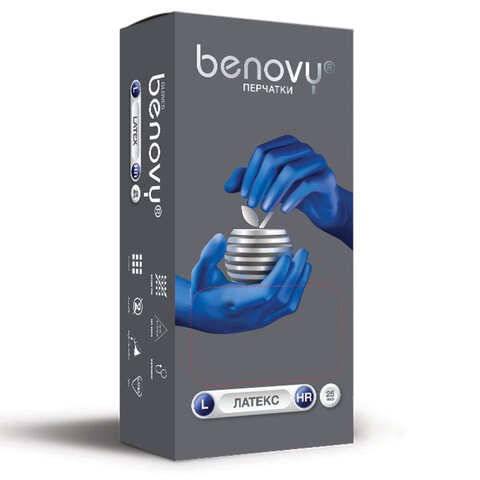 Перчатки латексные смотровые 25 пар (50 штук), размер 8-9, L (большой), синие, BENOVY High Risk