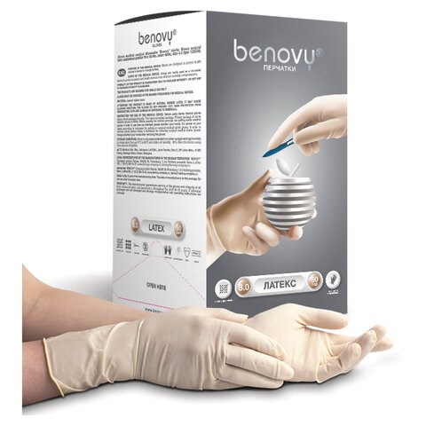 Перчатки латексные стерильные хирургические, КОМПЛЕКТ 50 пар (100 шт.) неопудренные BENOVY, ЧЗ, размер L (8)