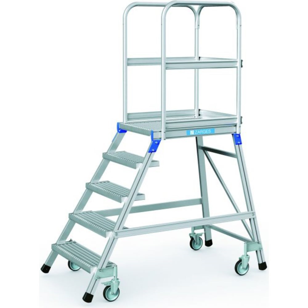 Передвижные алюминиевые подмости с односторонним подъемом 5 ступеней из стали Zarges 41953 Безопасное и легкое решение для гибкости в работе: удобный подъем устойчивое положение, благодаря четырем подпружиненным роликам и легкость в обращении. Решетчатые противоскользящие ступени и платформа изготовлены из стали. Простая и быстрая сборка благодаря применению новых соединительных элементов. Удобный подъем благодаря ступеням глубиной 200 мм. Рабочая площадка 600 x 800 мм. Мобильность и быстрая готовность к использованию, благодаря четырем подпружиненным поворотным роликом (два из них снабжены фиксаторами). Максимальная безопасность благодаря ограждению платформы с трех сторон, высотой 1,00 м Максимальная нагрузка 150 кг.