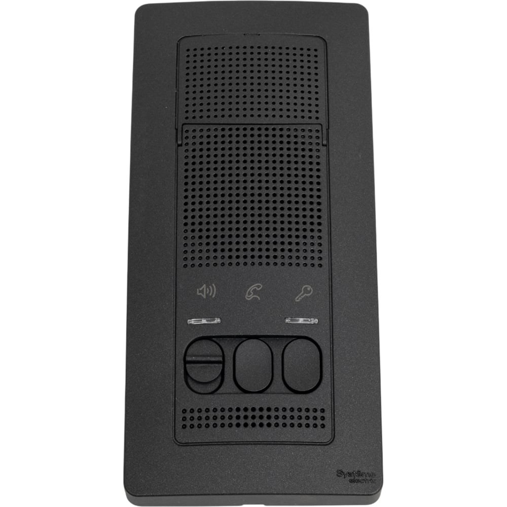 Устройство Systeme Electric(ранееSchneider Electric) BLANCA (цвет – антрацит) переговорное настенного монтажа.предназначено для домофонных системпитается от батарейки (3 элемента питания ААА х 1,5В)громкость устройства регулируется, нанесены символы «Звук» и «Разговор»размеры устройства: 187*84*25 мм