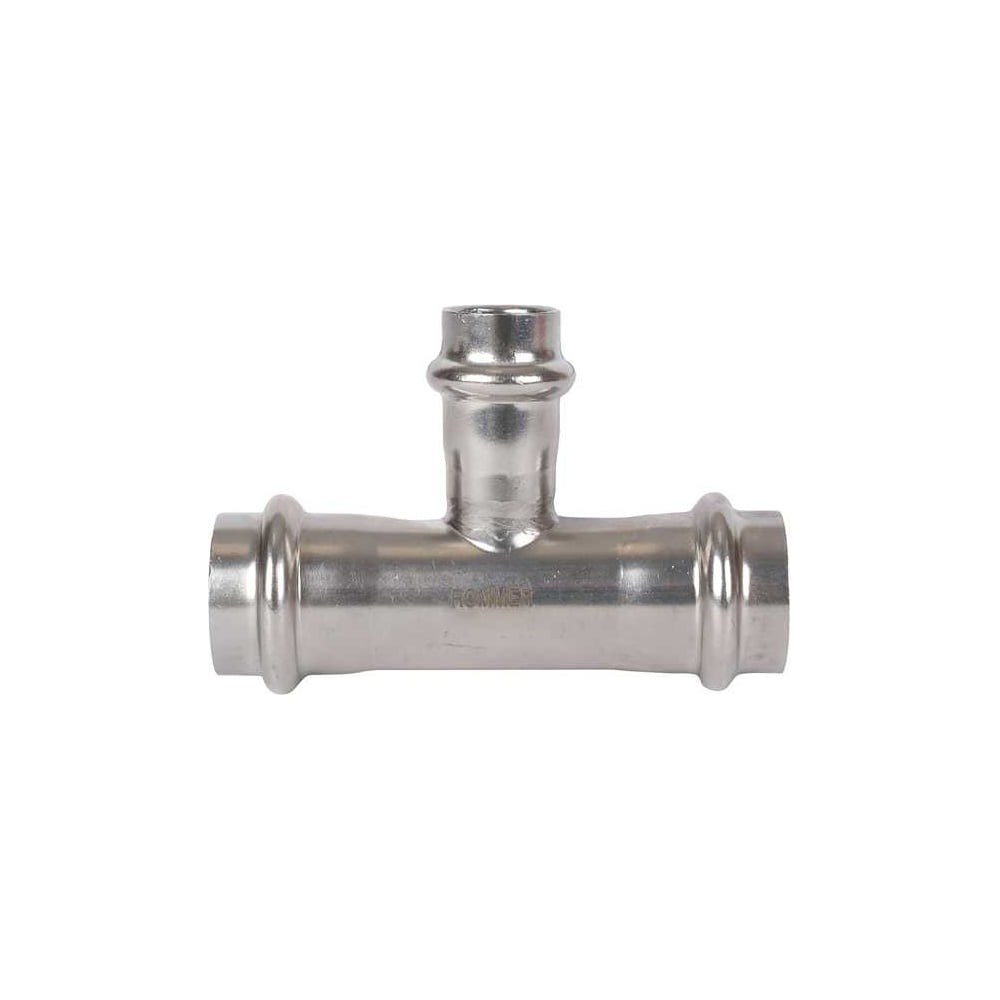 Тройник обеспечивает надежное и герметичное соединение труб. Изготовлен из высококачественной нержавеющей стали SU304, а толщина стенок составляет 1,5 мм. Для прессования фитинга применяется профиль V-образной насадки инструмента, что обеспечивает качественное соединение элементов трубопровода. Системы, собранные из «нержавейки», выглядят крайне презентабельно и эстетично. Сами трубы не нуждаются в дополнительной обработке и не окисляются со временем.