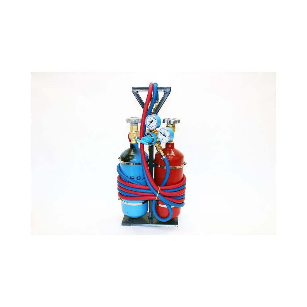 Назначение Переносной газосварочный пост ПГСП-2/2 Ш (на штативе) оснащен кислородным и пропановым баллонами и предназначен для пайки, резки, нагрева и других технологических операций при работе с цветными и черными металлами в местах, удаленных от газовых источников питания. Технические характеристики Производительность смеси кислород+пропан 2250°С Время максимального нагрева до 2250 С 5-10 с Длина ядра пламени 8 - 10 мм Емкость кислородного баллона 2л Емкость пропанового баллона 2л Длина рукавов 3 м Габаритные размеры (ВхШхГ) 540х220х110 Вес 12 кг ПГСП-2/2Ш представляет собой переносное газосварочное устройство, состоящее из штатива, на котором установлены кислородный баллон с редуктором, пропановый баллон с редуктором, соединительные кислородный (синий) и пропановый (красный) рукава и горелка.