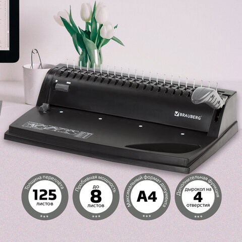 Переплетная машина для пластиковой пружины BRAUBERG B8, пробивает до 8 листов, сшивает до 125 листов, 530958