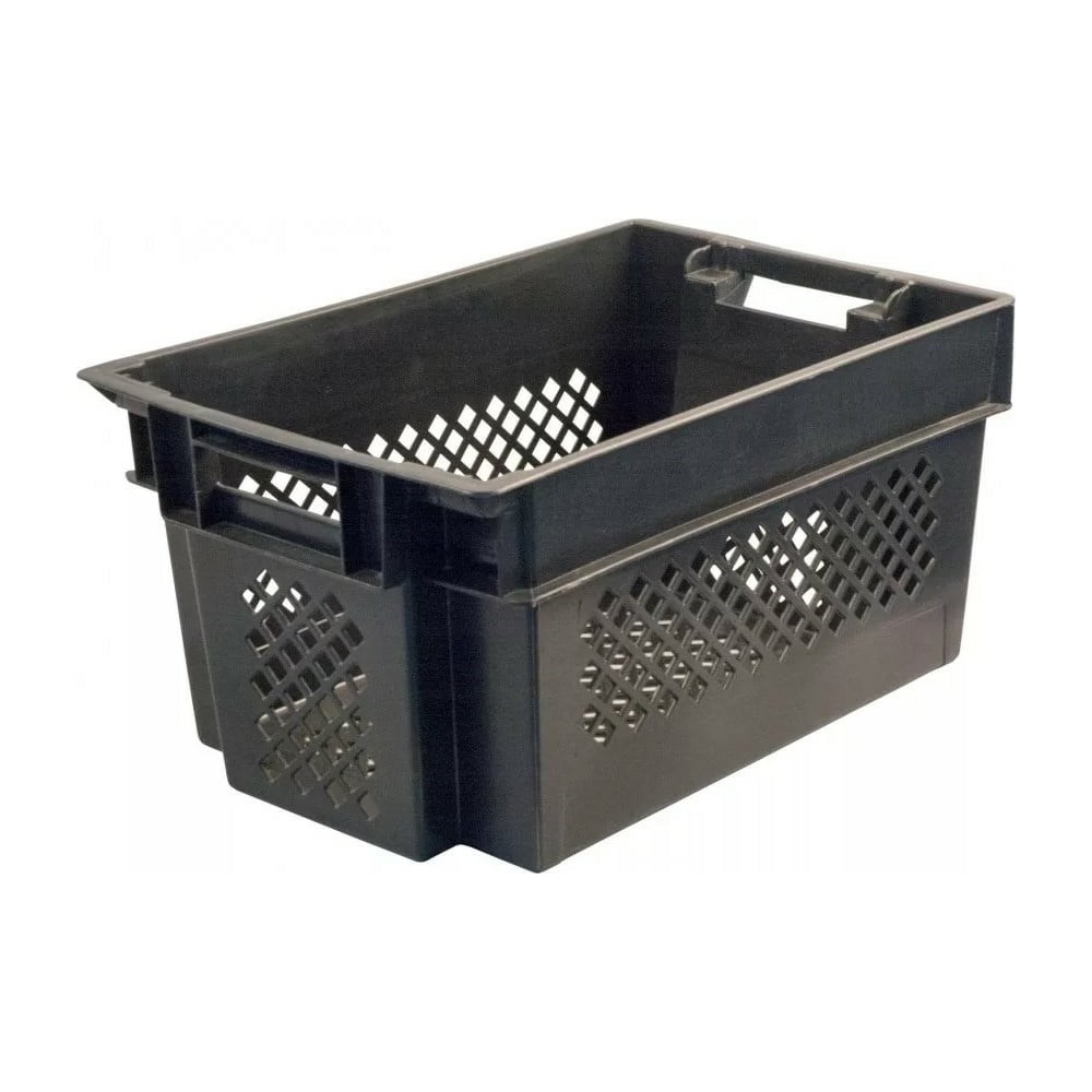 Перфорированный ящик ООО Агростройлидер черный САД-13.25 предназначен для сбора, хранения и транспортировки овощей и фруктов. Перфорация дна и стенок обеспечивает постоянную циркуляцию воздуха для сохранения свежести содержимого. Материал - полипропилен.
