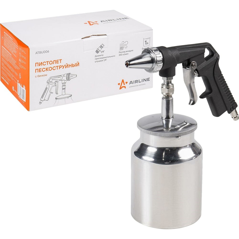Пескоструйный пистолет с бачком Airline ATBU006 изготовлен из алюминиевого сплава. Абразив подаётся из съёмного бачка. В комплект входит присоединительный фитинг 1/4".