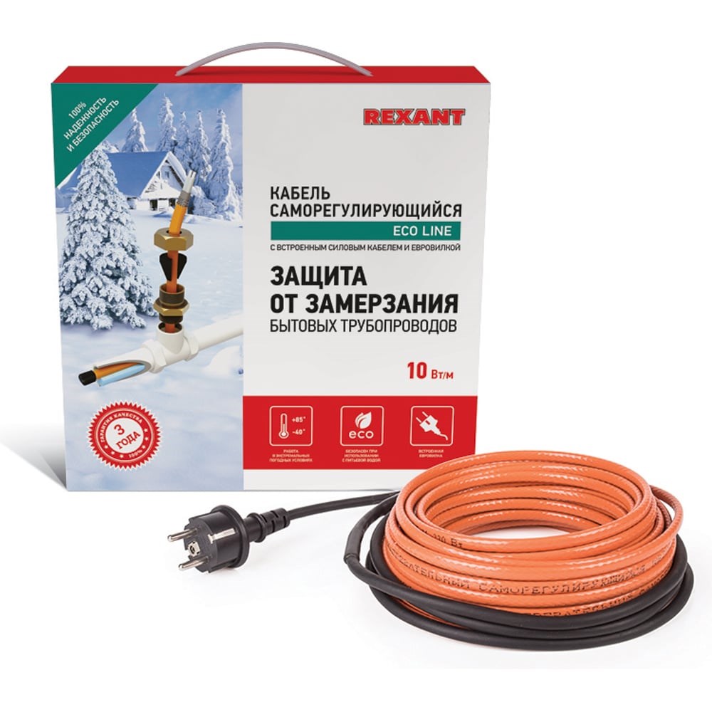 Комплект саморегулирующегося кабеля HTM-CT REXANT мощностью 10 Вт/м используется в качестве профилактики замерзания бытовых трубопроводов среднего диаметра, счетчиков воды, вентилей и так далее. Самогреющийся провод соединен с питающим кабелем, на конце которого находится евровилка для подключения в сеть 220 В. В стандартных условиях температура нагревательного электрошнура не превышает 65°C.Комплекты подходят для использования как в помещениях, так и на улице благодаря классу защиты IP67. Кабель может быть смонтирован на поверхности как металлической, так и пластиковой трубы, под теплоизоляцией, а также установлен внутрь трубы, в том числе и с питьевой водой. Витки могут пересекаться сами с собой.Установка в трубу осуществляется с помощью комплекта для ввода кабеля (арт. 51-0610-1 или 51-0610-2). При монтаже на поверхности трубы витками необходимо отслеживать минимальный радиус изгиба кабеля – 40 мм.