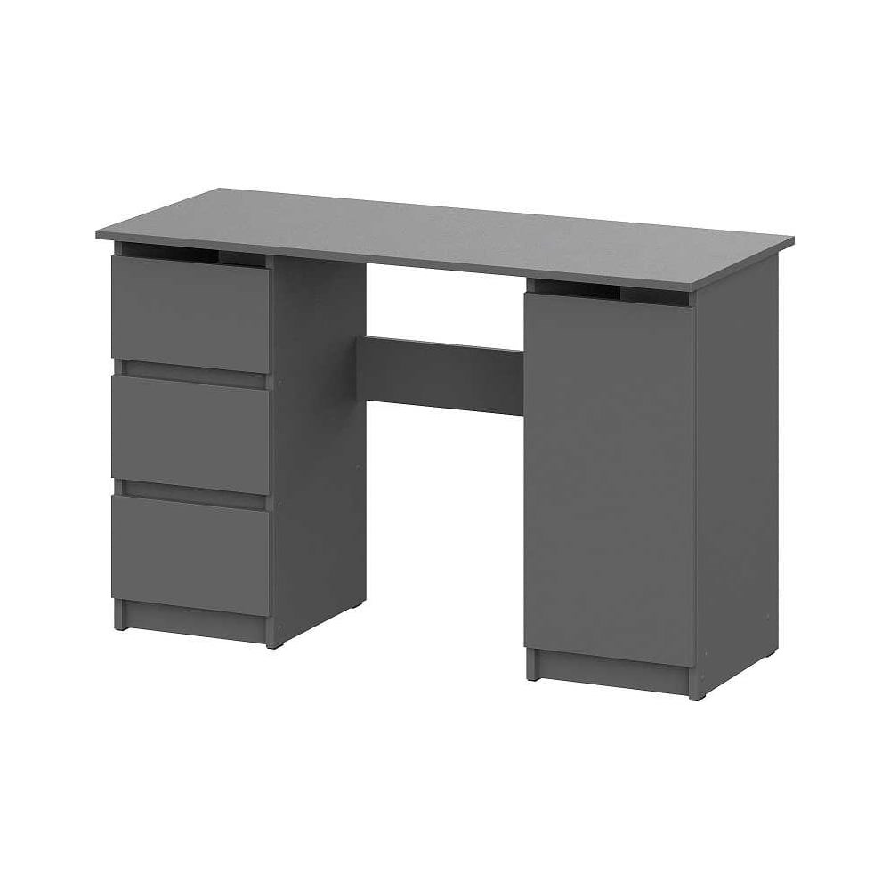 Письменный стол Денвер в цвете графит - это идеальное сочетание стиля и функциональности. Он имеет просторную рабочую поверхность, на которой вы сможете разместить все необходимые предметы. Цвет графит придает столу стильный и современный вид, который гармонично впишется в любой интерьер. Стол выполнен из материала ЛДСП. Стол оснащен тремя выдвижными ящиками, которые позволят вместить все необходимое для успешной работы и откидной дверкой, за которой расположена полка. корпус ЛДСП 16 мм графит серый фасад ЛДСП графит серый направляющие роликовые скрытая фурнитура сборка стола универсальная нагрузка на столешницу 20 кг нагрузка на полки 5 кг