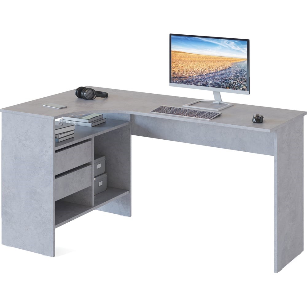 Письменный стол СОКОЛ СПм-25 левый, бетон 00-00011530 — идеально решение для обустройства полноценного рабочего места в домашнем кабинете или офисе. На широкой столешнице найдется место для большого монитора, клавиатуры или ноутбука, а также сопутствующей техники. В выдвижных ящиках и открытых отделениях удобно хранить книги и канцелярию. Кроме того, конструкцией предусмотрена ниша под системный блок.Характеристики:Материал: ЛДСП.Тип направляющих: шариковые полного выдвижения.Ориентация сборки: левосторонняя (определяется по расположению тумбы).Задняя стенка сделана из ДВП белого цвета.