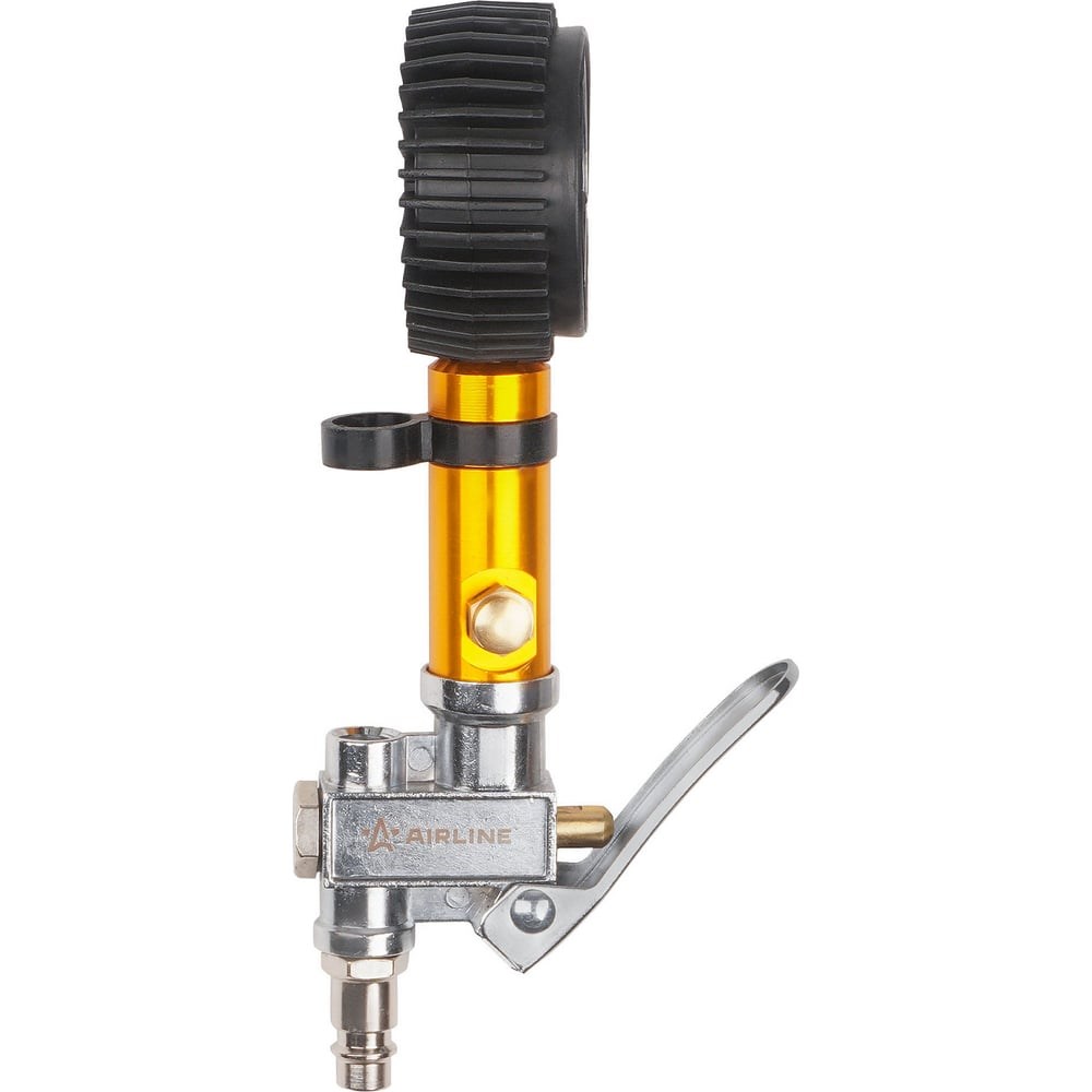Пистолет для накачки шин грузовой с манометром 15 АТМ AIRLINE ATBU045 изготовлен из алюминиевого сплава. Манометр защищен резиновым чехлом. Гибкий шланг имеет быстросъемный наконечник. Конструкцией предусмотрена кнопка для сброса лишнего давления. В комплект входит присоединительный фитинг 1/4". Длина шланга с наконечником, мм: 460.
