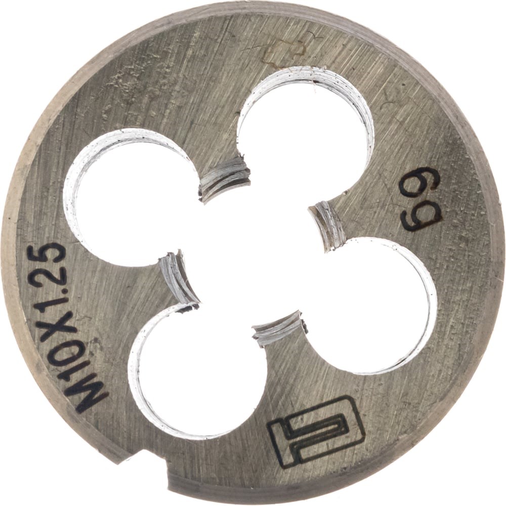 Плашка М10 х 1,25 мм СИБРТЕХ 77025 является резьбонарезным инструментом. Для обеспечения прочности изделие изготовлено из инструментальной стали. Твердость режущих кромок составляет 60 HRc. По специальным отверстиям происходит отвод стружки.