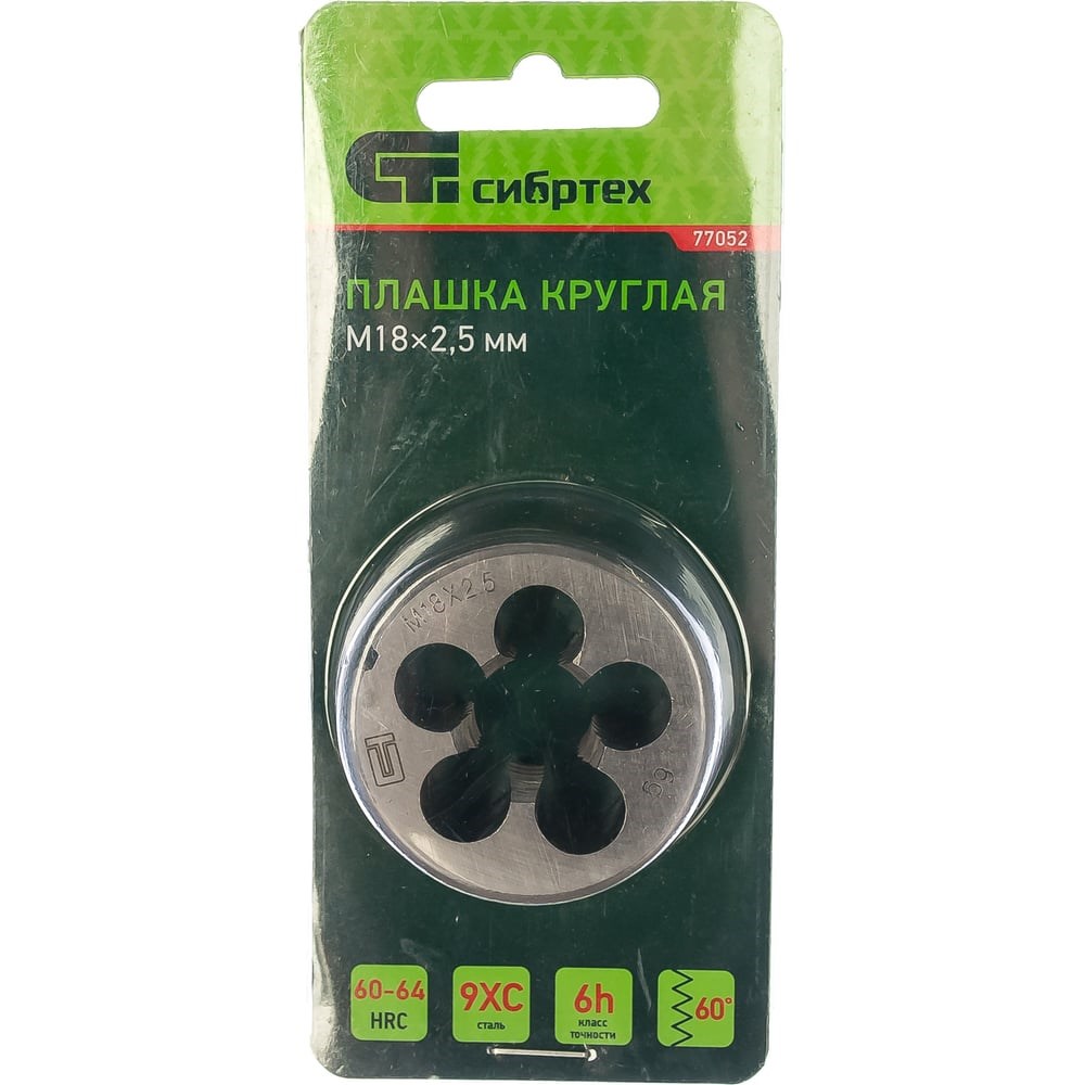Плашка М18 х 2,5 мм СИБРТЕХ 77052 круглой формы используется для нанесения резьбы на заготовку. Обладает высокими механическими свойствами, так как изготовлена из инструментальной стали. В плашке есть несколько отверстий с режущими кромками твердостью 60 HRc.