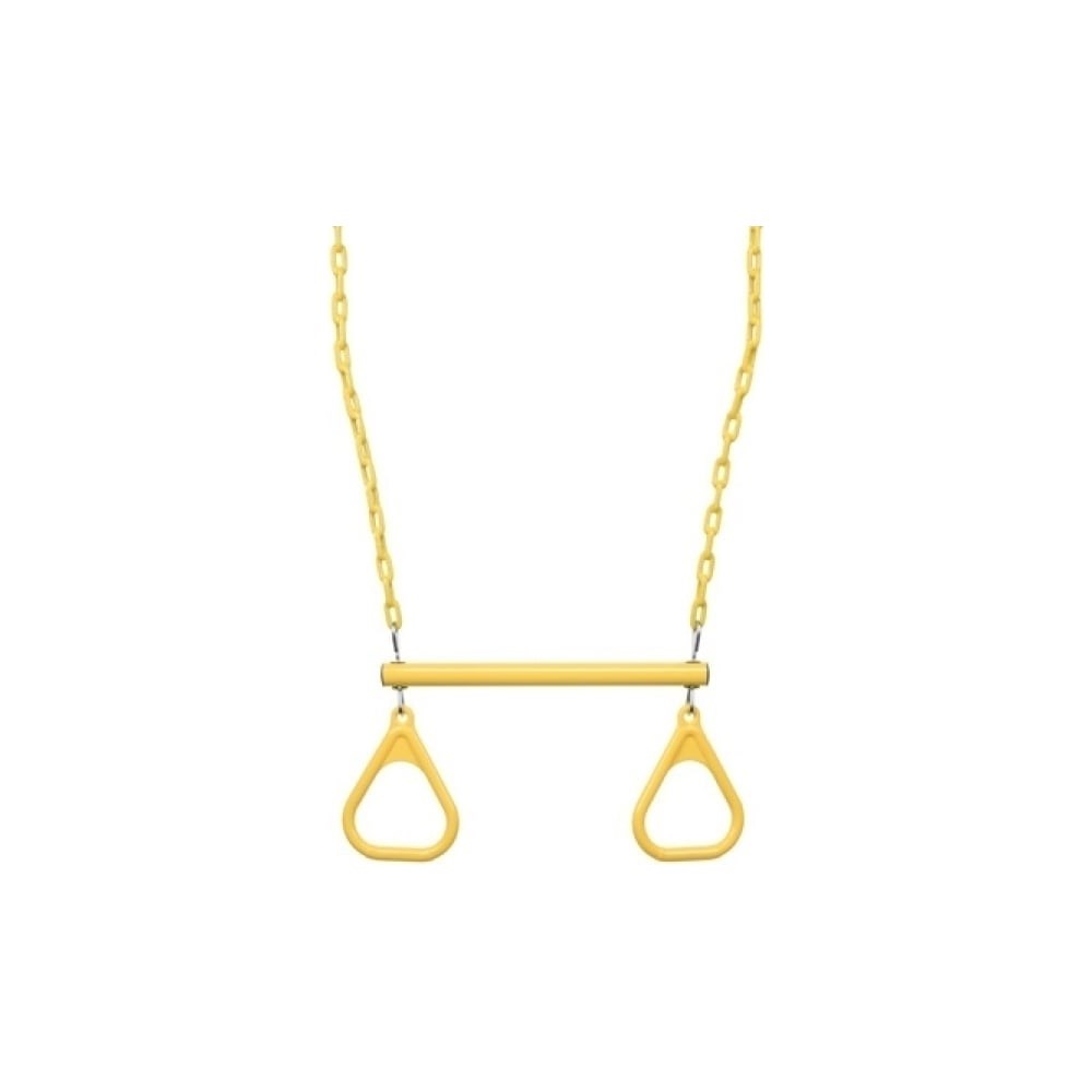 Пластиковая качель трапеция с кольцами MoyDvor желтая SAC000122Y предназначена для обустройства уличных детских игровых площадок. Изделие способно выдержать нагрузку до 90 кг. Цепной подвес с пластиковой оплеткой цепи.