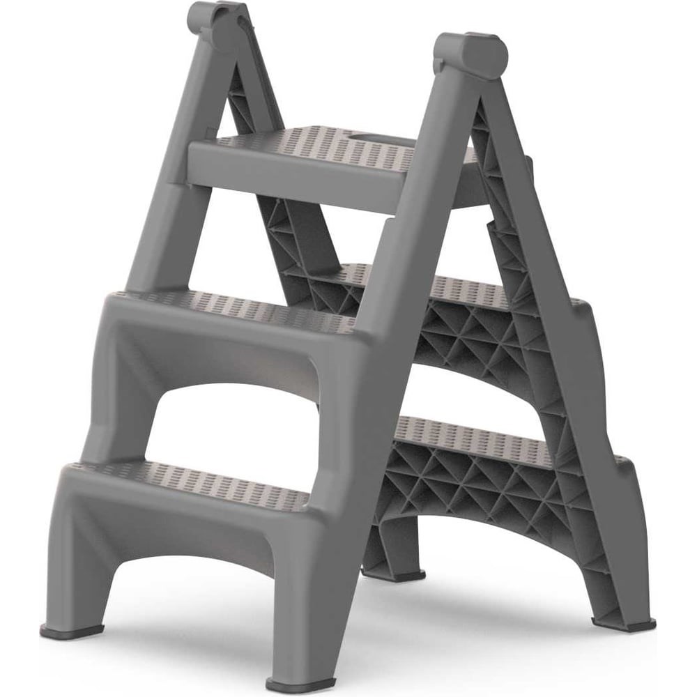 Стремянка исполнена из усиленного полипропилена. Крепкая и долговечная конструкция предназначена для усилия до 150 кг. Широкие ступени глубиной 110 мм, а так же верхняя ступень 200 мм делают подъем комфортным. Специальный узор на ступенях предотвращает скольжение стопы, делает подъем и спуск безопасным. Опоры из прочного нескользящего пластика обеспечивают устойчивое положение. Ступени с двух сторон позволяют работать не переставляя стремянку, тем самым экономя время.
