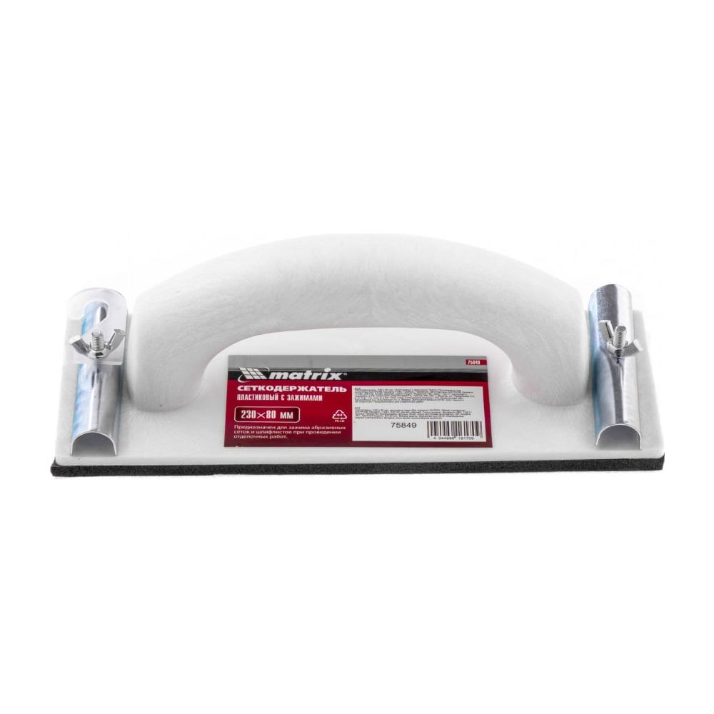 Сеткодержатель Matrix 75849, 230 х 80 мм, пластиковый с зажимами, используется для ручного шлифования деревянных, шпатлеванных, металлических, пластмассовых и прочих твердых поверхностей. Сеткодержатель фиксирует абразивную стеклосетку или шлифлист и позволяет удалять старые отделочные покрытия, подготавливать поверхность под покраску, а также выполнять чистовую обработку.