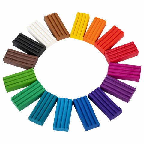 В набор входят 16 брусков по 15 г разных цветов: белый, черный, синий, красный, желтый, зеленый, коричневый, оранжевый, голубой, светло-зеленый, фиолетовый, розовый, светло-коричневый, темно-красный, бирюзовый, сиреневый. Масса набора - 240 г. Со стеком.
