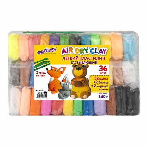 Набор состоит из супер легкого воздушного пластилина высокого качества ярких цветов и стеков, вносящих разнообразие в игры с лепкой. 36 цветов позволят ребенку создать действительно уникальную поделку, миниатюрную скульптуру или картину. Чтобы поделка застыла, ее необходимо оставить на открытом воздухе.