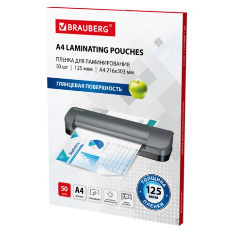 Пленка для ламинирования BRAUBERG формата А4 (216х303 мм) имеет уникальный состав: полиэтилентерефталат (PET), этиленвинилацетат (EVA), полиэтилен (LDPE). Промежуточный слой полиэтилена (LDPE) выступает как связующий элемент между слоями PET и EVA, служит дополнительной защитой от вероятного вытекания клея из-под пленки при ламинировании. Полиэтилен (PE) придает пакетам прочность эластичность и износостойкость. Глянцевое покрытие пленки способствует сохранению и максимальной передаче цвета ламинируемого изображения.