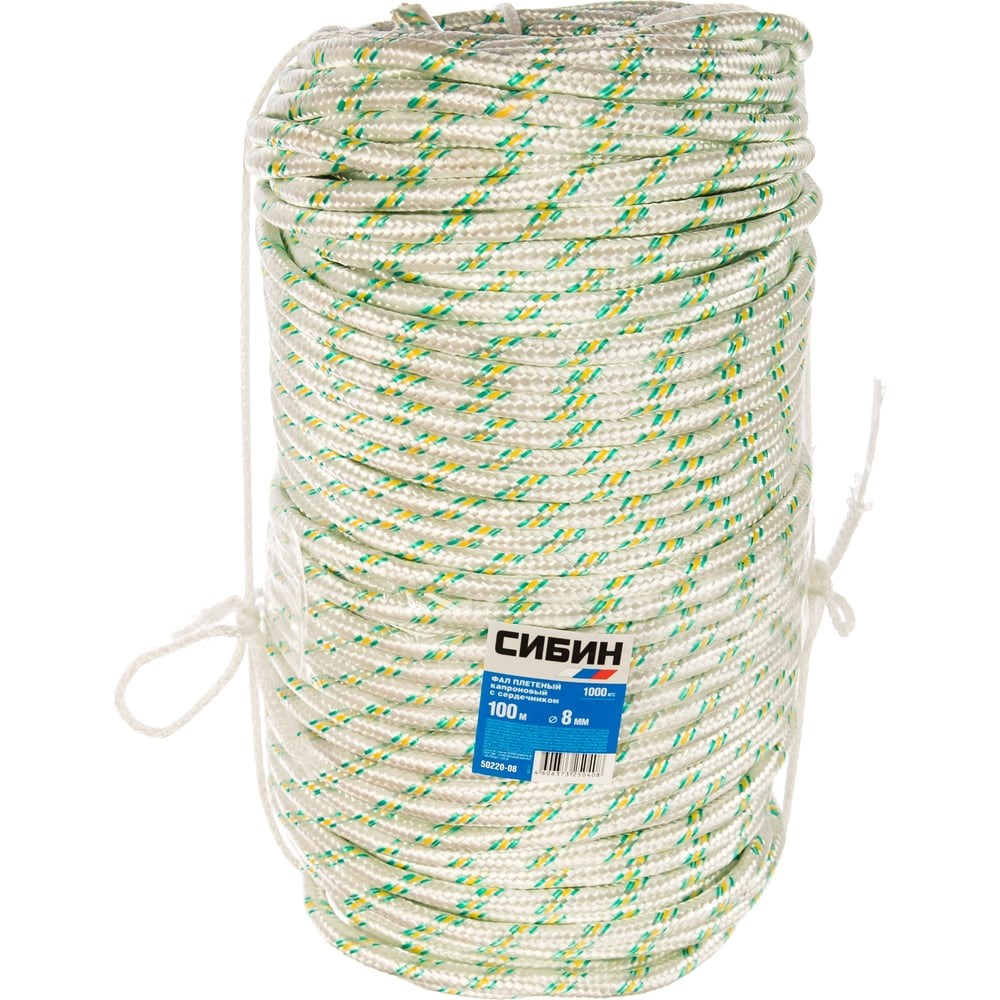 Плетёный капроновый 16-прядный фал с капроновым сердечником, диаметр 8мм, бухта 100м, 1000кгс СИБИН 50220-08 - прочное, надежное и долговечное изделие из качественного искусственного материала. Не тонет в воде, не усаживается от влаги, не теряет свою прочность при намокании, не гниет и не разрушается под действием ультрафиолета и химикатов (кислот, щелочей, растворителей и пр).