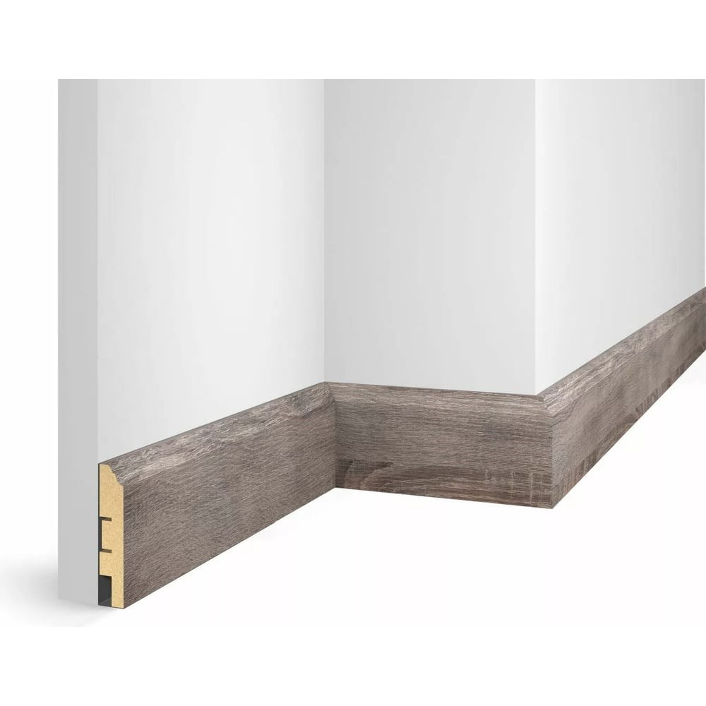 Плинтус COSCA DECOR WP07 экошпон, дуб дымчатый, 80x16x2400 мм, МДФ СПБ103733 выполнен из MDF (древесное волокно с добавлением лигнина и парафина) с декоративным покрытием экошпон. Технология производства плит MDF улучшает свойства простого дерева, такие как влагостойкость, однородная прочная структуру, не коробится. Особенности производства покрытия, позволили создавать тиснение, которое максимально приближено к натуральному шпону, с визуальными и тактильными ощущениями близкими к натуральной древесине. В составе покрытия многослойная, высококачественная бумага, сочетающая от четырех до шести цветовых оттенков в одном декоре, что дает ощущение перелива и мягкости цвета. Верхний слой покрытия - защитный лак, нанесенный по технологии электронно-лучевого отверждения, что обеспечивают высокую эксплуатационную устойчивость декоративного покрытия.