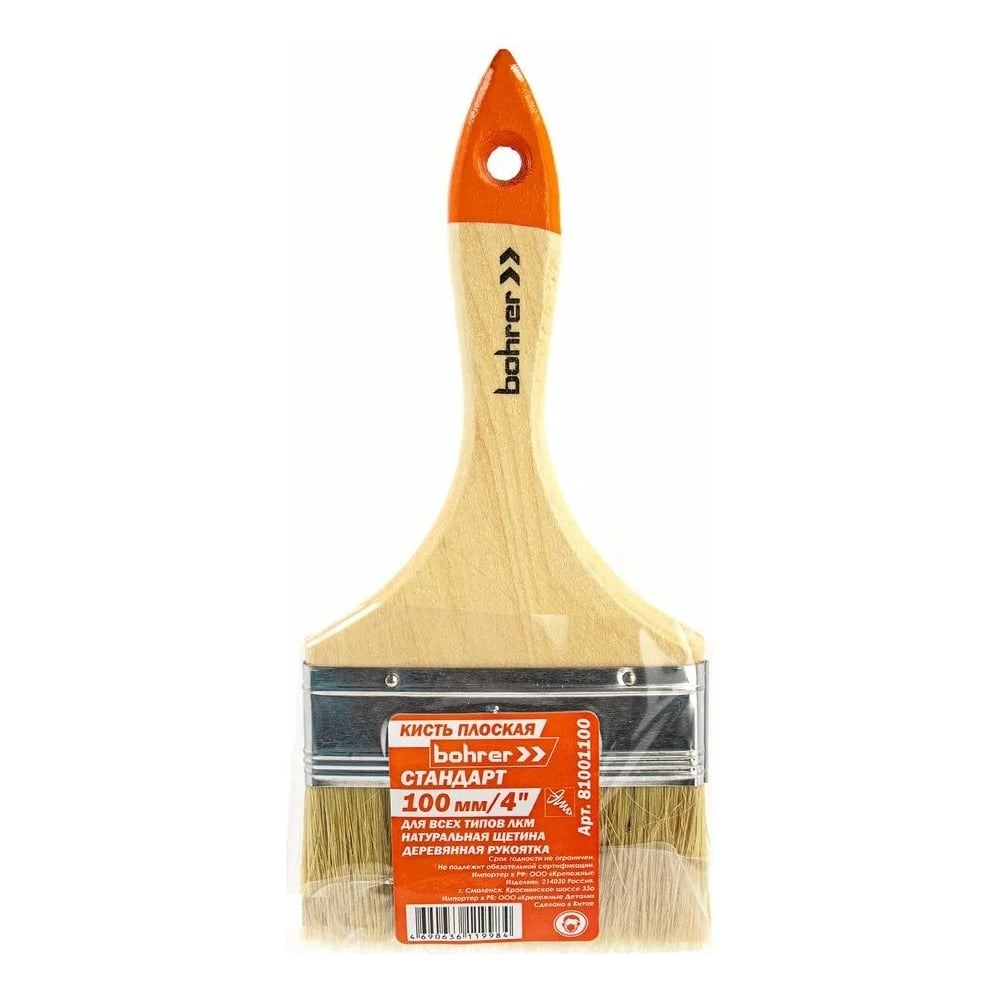 Плоская кисть BOHRER Стандарт 100 мм, 4 натур. щетина, 44x12 мм, деревянная рукоятка 81001100 предназначена для выполнения любых видов отделочных работ – покраски, шпатлевки, грунтовки, поклейки обоев и т. д. Конструкция кисти обеспечивает плотное прилегание щетины к рукоятке и отсутствие выпадающих волосков. Эргономичная деревянная рукоять удобно лежит в руках. Натуральная щетина позволяет равномерно нанести ЛКМ на поверхность.