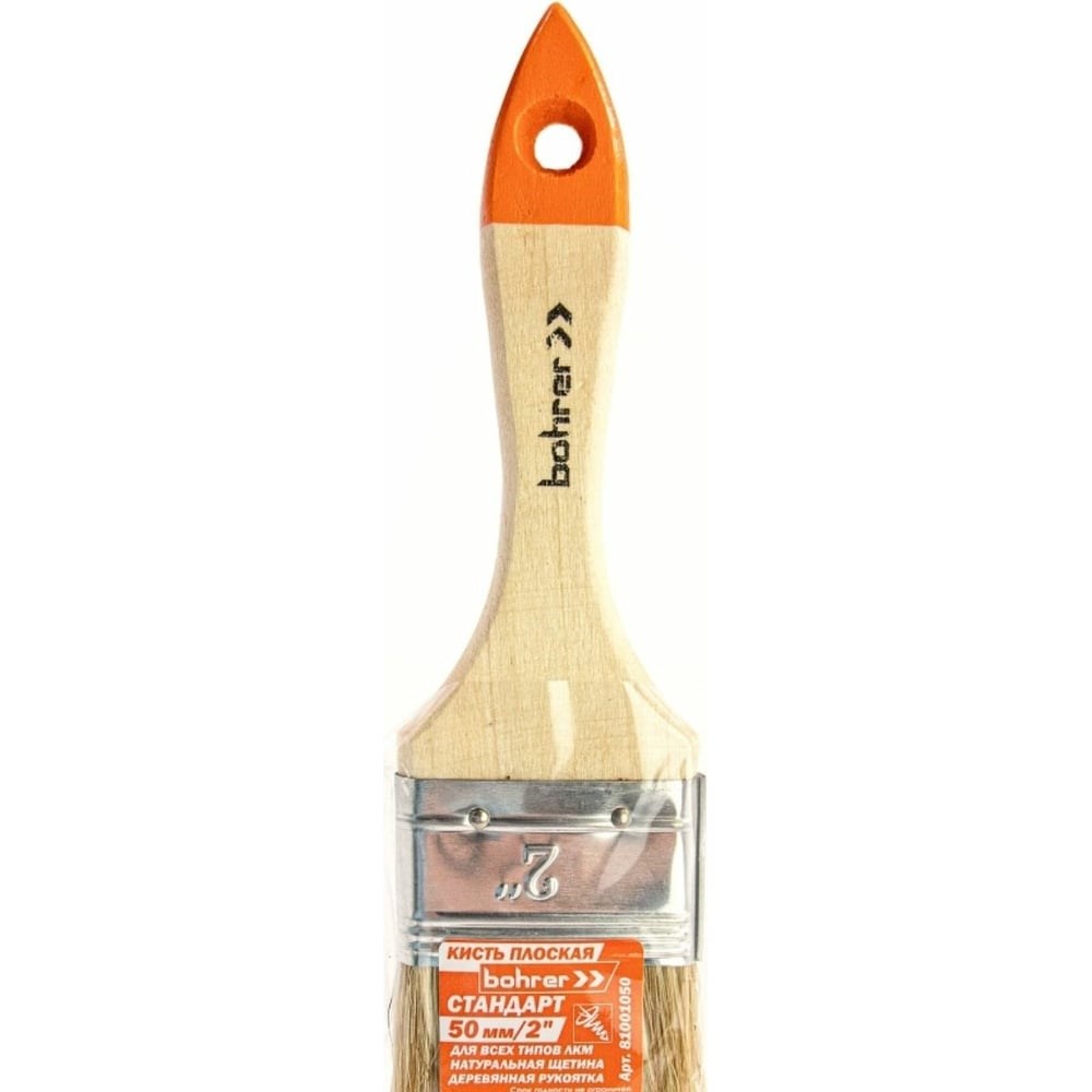 Плоская кисть BOHRER Стандарт 50 мм, 2 натур. щетина, 44x11 мм, деревянная рукоятка 12 шт 81001050 предназначена для выполнения любых видов отделочных работ – покраски, шпатлевки, грунтовки, поклейки обоев и т. д. Конструкция кисти обеспечивает плотное прилегание щетины к рукоятке и отсутствие выпадающих волосков. Эргономичная деревянная рукоять удобно лежит в руках. Натуральная щетина позволяет равномерно нанести ЛКМ на поверхность.