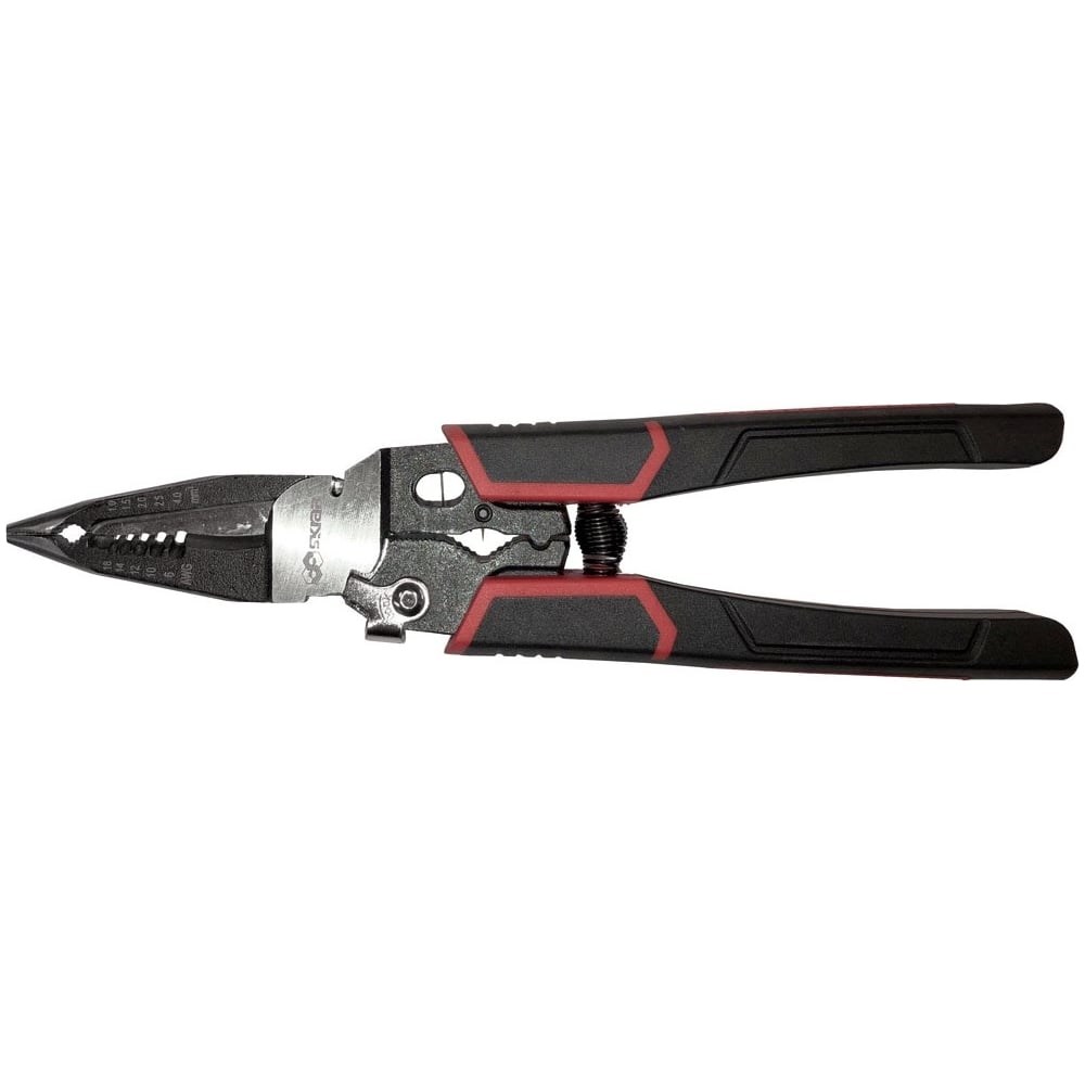 Плоскогубцы 225мм МУЛЬТИ 9в1 выполняют 9 функций в 1 устройстве: Плоскогубцы (зажимные губки) Клещи (зажим гаек/винтов) Зачистные клещи (зачистка кабеля 1.0/1.5/2.0/2.5/4 мм 2 AWG18/14/12/10/6) Кабелерез (резка кабеля до 10 мм) Кусачки (резка проволоки до 2 мм) Тяговый зажим (снятие изоляции) Подрезка изоляции (круговая 1-4 мм2) Стриппер продольный (разделочный нож до 12 мм) Кримпер (обжим клемами)