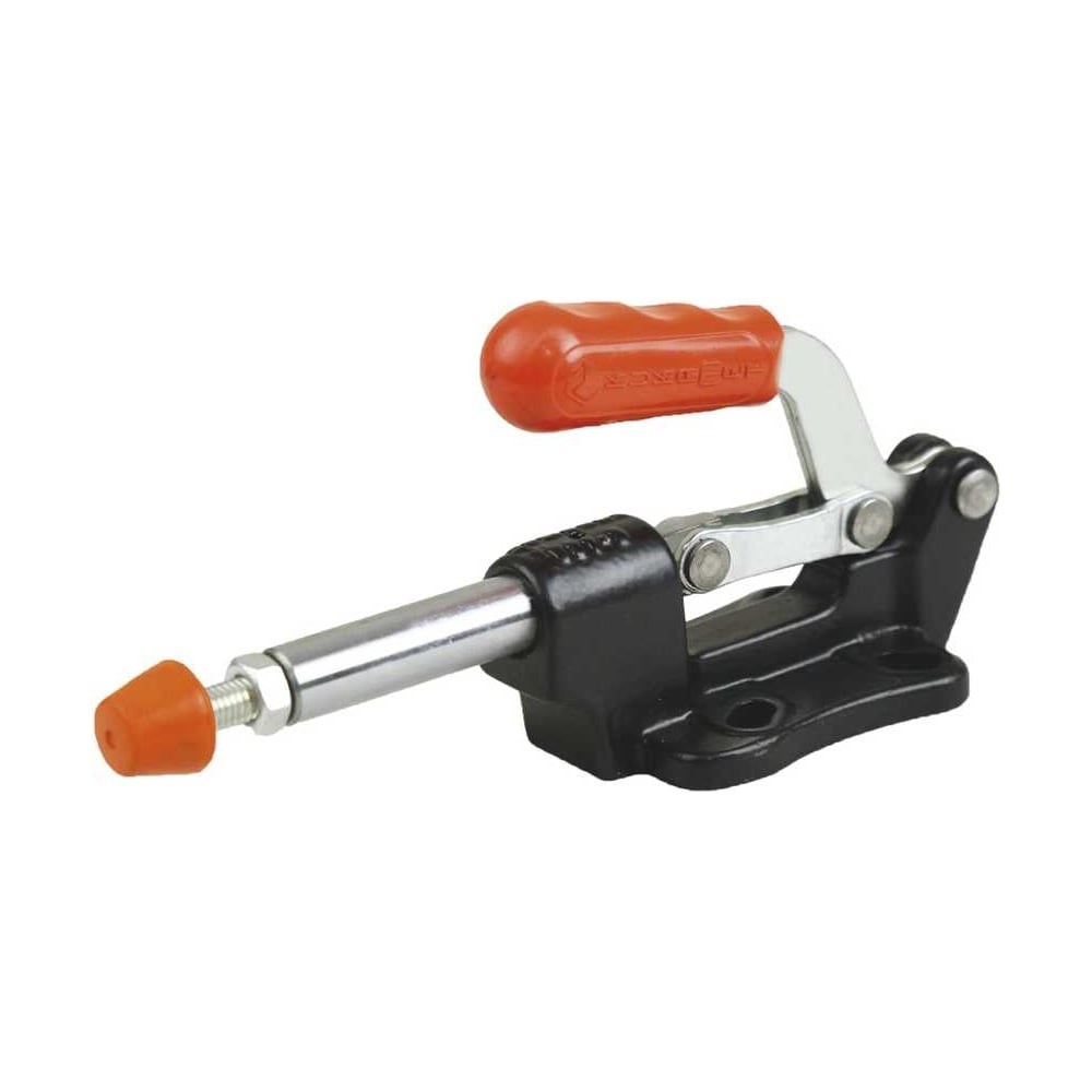 Материалы:Основание литое из прочного чугуна GGG-60.Толкающая штанга, рукоятка и нажимной винт из стали.Заклепки из нержавеющей стали 304.Упор из силикона.Насадка на рукоятку из полиуретана.Исполнение:Чугун покрыт электростатической порошковой краской черного цвета.Толкающая штанга хромированная.Сталь оцинкованная.Втулки закаленные.Ход плунжера: 38 мм.Нажимной винт: M8X50.F1 зажимное усилие: 2500 Н.F3 крепежная сила: 3700 Н.Fi усилие от руки (F1:Fi): 16:1